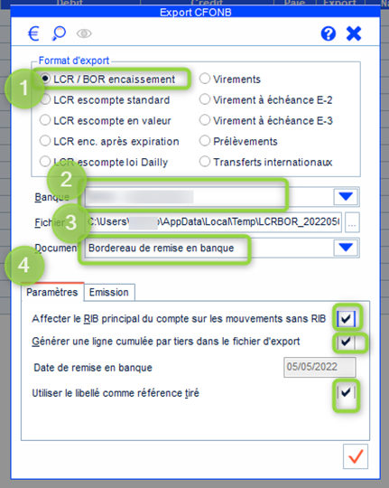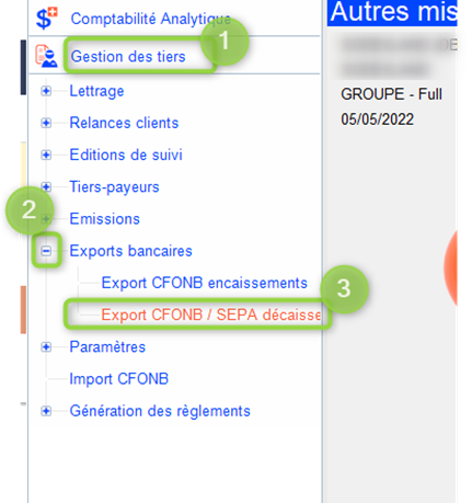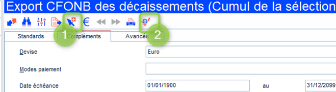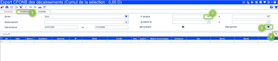 Gestion des tiers > Exports bancaires > Export CFONB / SEPA décaissement.- Dans l’onglet Compléments :