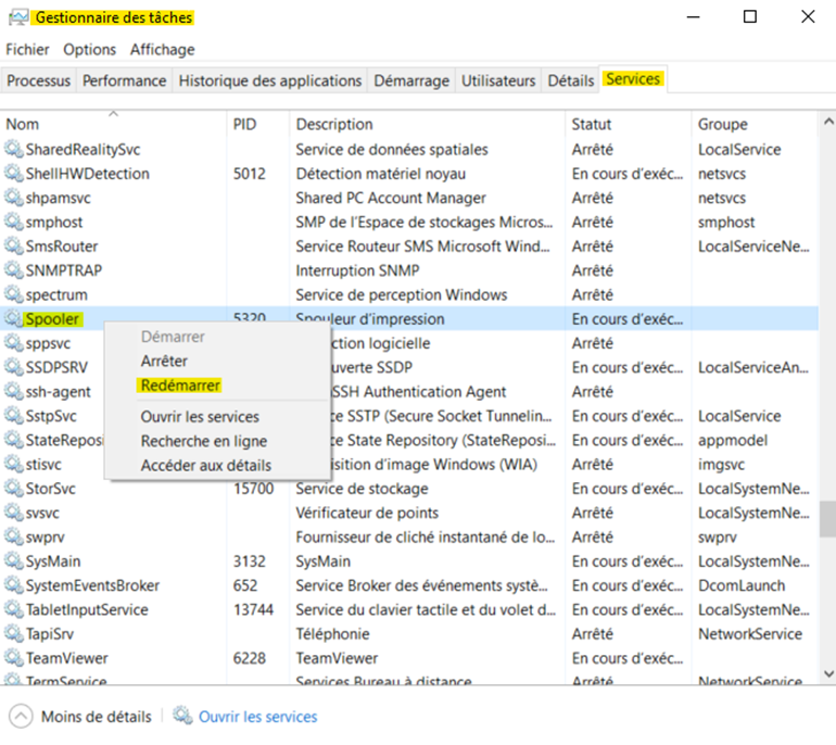 Le service Spooler est arrêté ou bloqué, empêchant la communication avec CEGID.