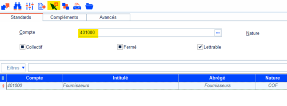 Sélectionner le compte en cliquant sur l’icône 'Flèche' ou en se positionnant sur la ligne du compte et en appuyant sur la barre espace.Cliquer sur l’icône de modification (à côté de l'icône 'Flèche').