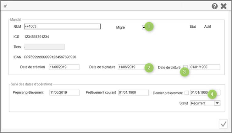 - Pas de date de clôture cochée et valeur = 01/01/1900, idem date de dernier prélèvement