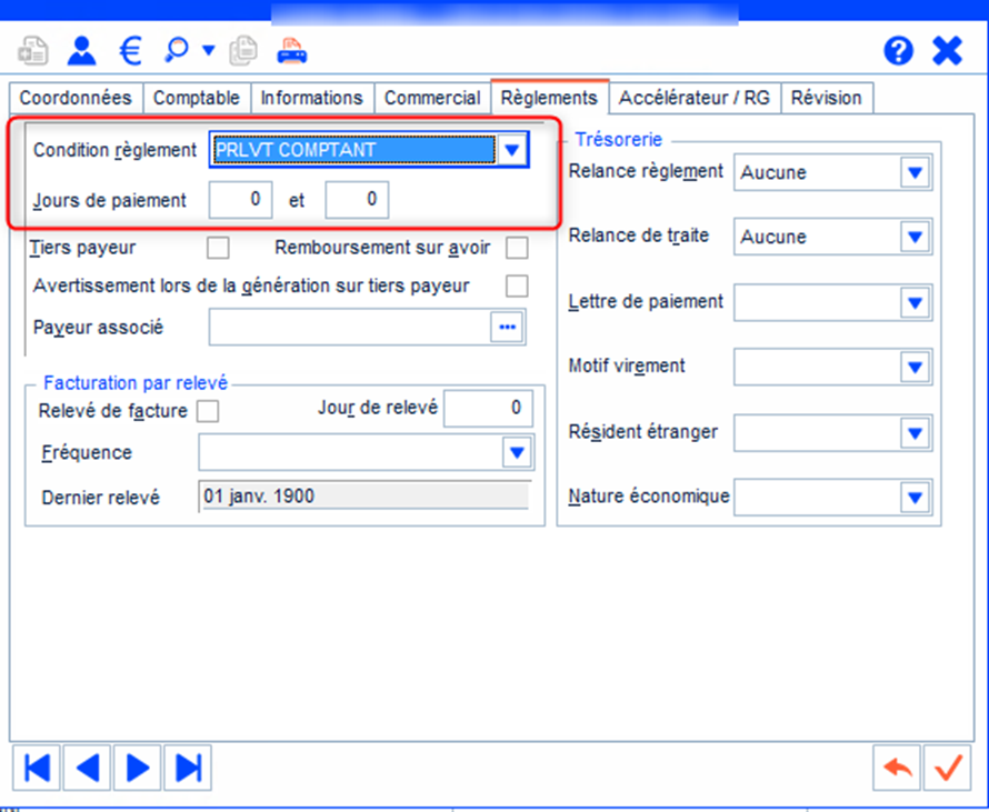 Dans le compte auxiliaire, renseigner les conditions de règlement pour que le client apparaisse dans le listing prélèvement/virement.