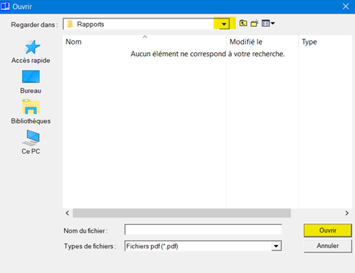- Cliquer sur la flèche (surlignée en jaune ci-dessous) pour ouvrir le dossier où se trouve le PDF.
