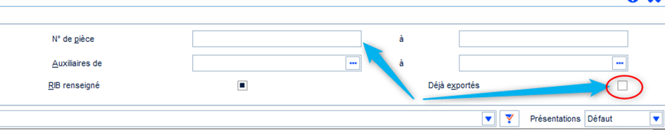 Saisir le « N° de pièce » et cocher « Déjà exportés ».