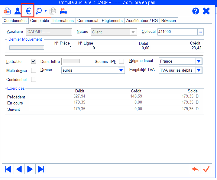 Accéder à la gestion des RIB de l’auxiliaire en cliquant sur le sigle €.