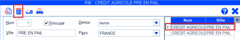 Se positionner sur l'un des deux RIB et le supprimer via l'icône Poubelle
