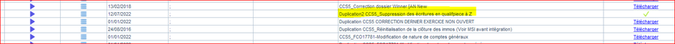 Identifier la ligne Duplication2 CCSS_Suppression des écritures en qualifpièce à Z et cliquer sur télécharger.