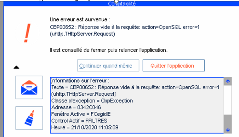 Chemin : C:\Users\AppData\Roaming\Cegid\Cegid Expert\LOG - Faire une capture d’écran du message d’erreur.