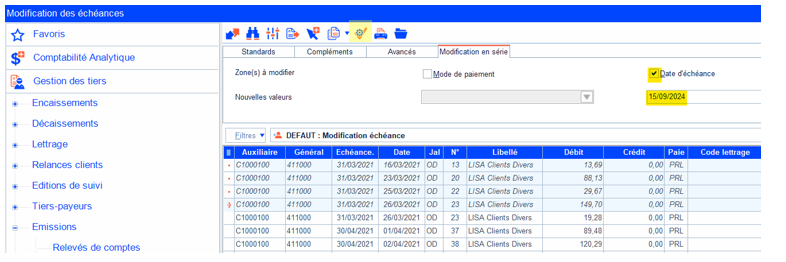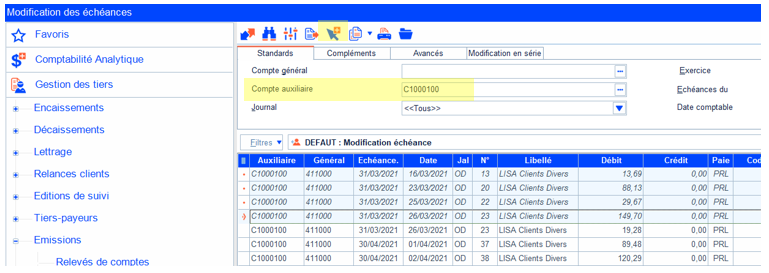 - Ouvrir : Autres missions > Gestion des tiers > Emissions > Modifications d’échéances.