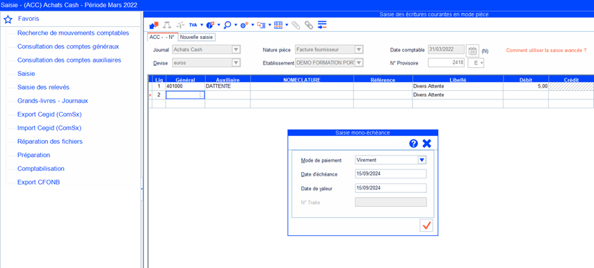 - Ouvrir : Traitements courants > Saisie.