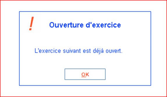 Lors de l’ouverture d’un nouvel exercice (menu Outils comptables / Clôtures / Ouverture d’exercice), le message d’erreur suivant apparaît :