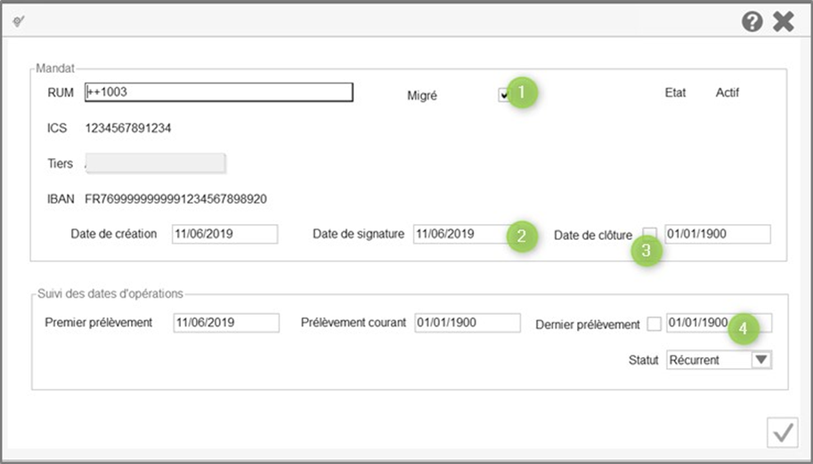 - La date de dernier prélèvement ne doit pas être cochée et doit être 01/01/1900 - 4.