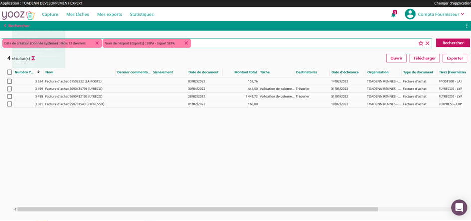 Pour obtenir la liste des factures payées et générer un bordereau de virement, il est nécessaire d’effectuer une recherche dans Yooz en utilisant les informations d’export (date et heure) présentes dans le nom du fichier ZIP d’export SEPA.