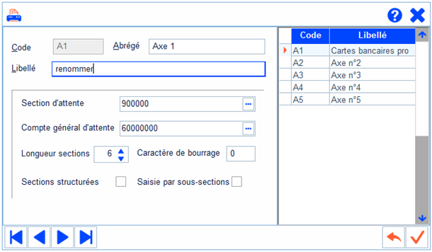 0, cela signifie que si la section saisie ne comporte que 4 caractères, les 2 manquants seront complétés par des zéros. - Le 5ᵉ axe est réservé à la TVA et ne peut pas être utilisé pour d’autres ventilations.