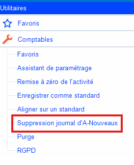 Supprimer les à-nouveaux : Utilitaires → Comptables → Suppression journal d'A-Nouveaux.