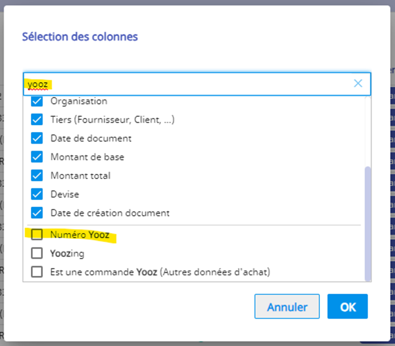 Vérifier que la colonne Numéro Yooz apparaît bien en tête de liste.