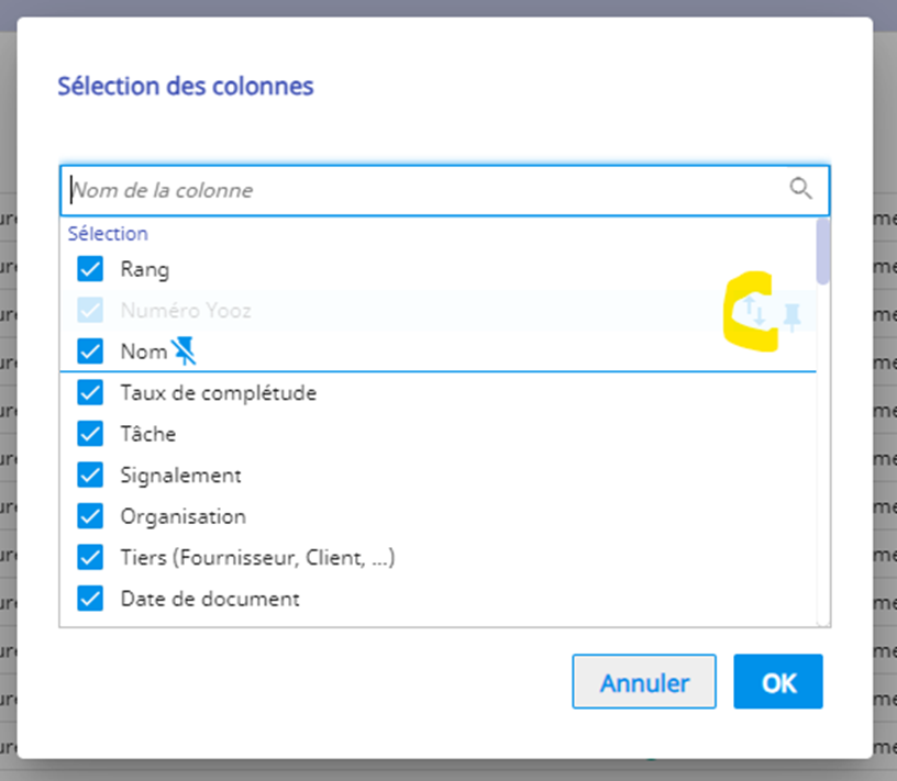 - Cette manipulation peut être répétée pour ajouter, supprimer ou réorganiser les colonnes dans toutes les listes des interfaces Yooz.