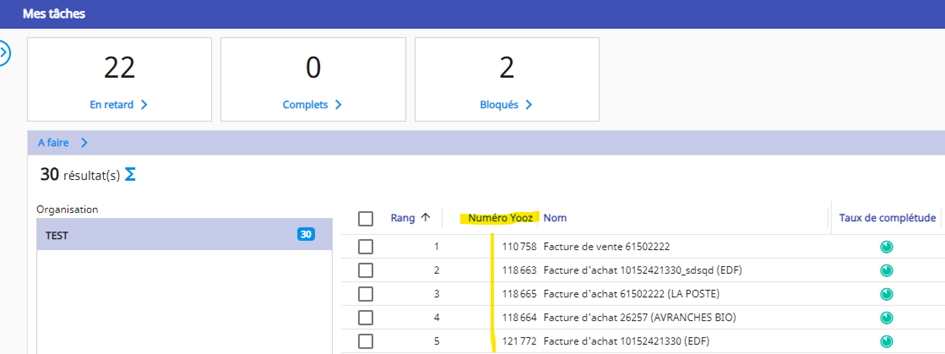 Activer et afficher la colonne Numéro Yooz dans l’onglet Mes Tâches pour faciliter le suivi des documents.