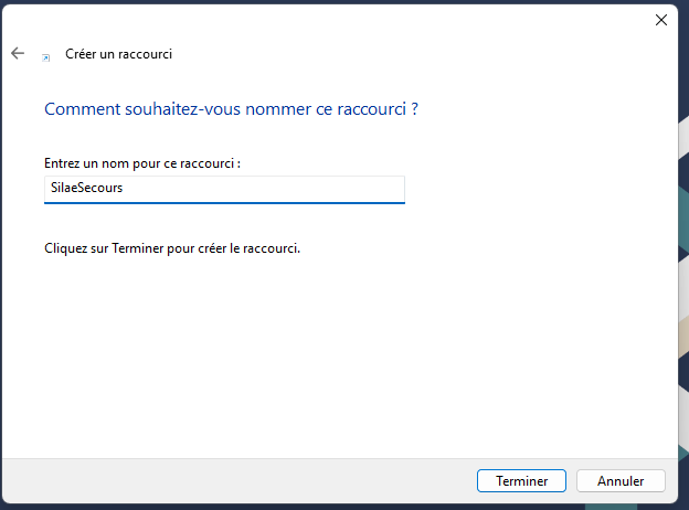 - Nommez le raccourci SilaeSecours, puis cliquez sur Terminer.