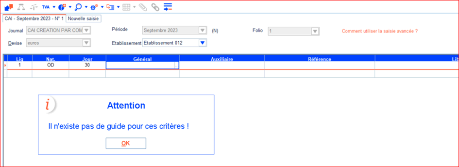 Lors de la saisie (menu : Traitements courants / Saisie), après recherche du guide via le raccourci ALT + G, le message suivant apparaît :