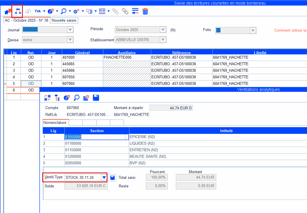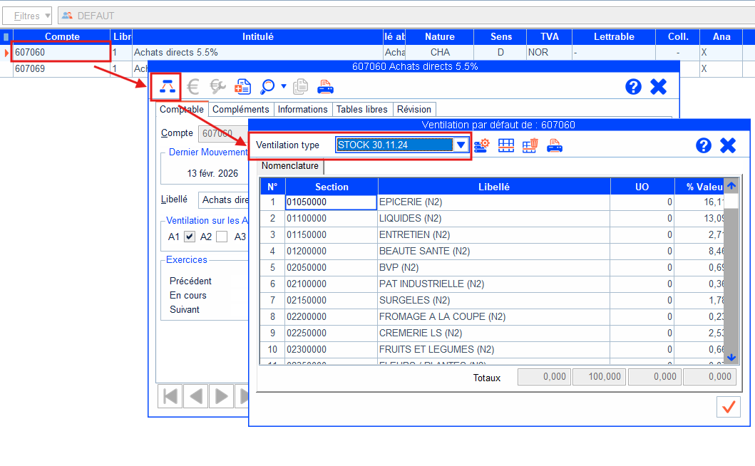Cette ventilation peut ensuite être appliquée depuis un compte général (il peut être nécessaire de supprimer la ventilation paramétrée manuellement sur ce compte en amont - voir solution 2).