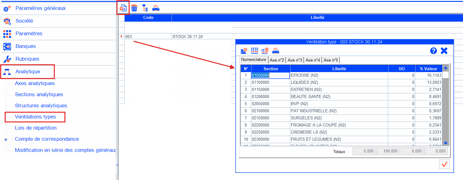 - Créer une nouvelle ventilation (en renseignant un code et un libellé) ou accéder à une ventilation existante.