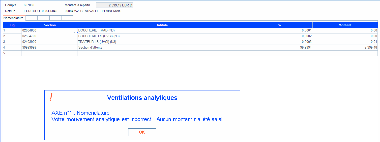 Les montants à zéro ne sont pas autorisés dans les ventilations analytiques paramétrées.