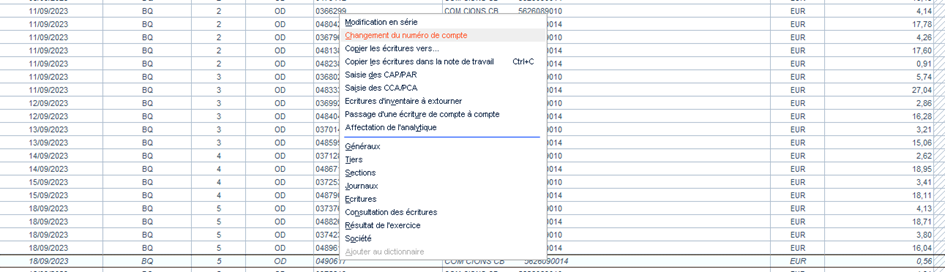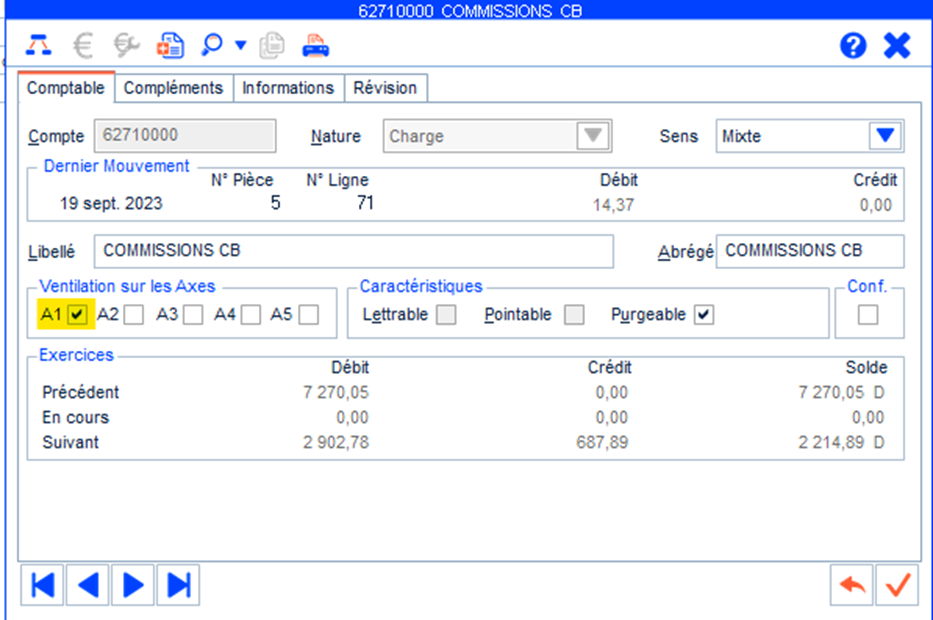 Exemple : le compte 62710000 COMMISSIONS CB possède un axe analytique, alors que le compte destinataire n’en a pas. Le reclassement est donc bloqué.