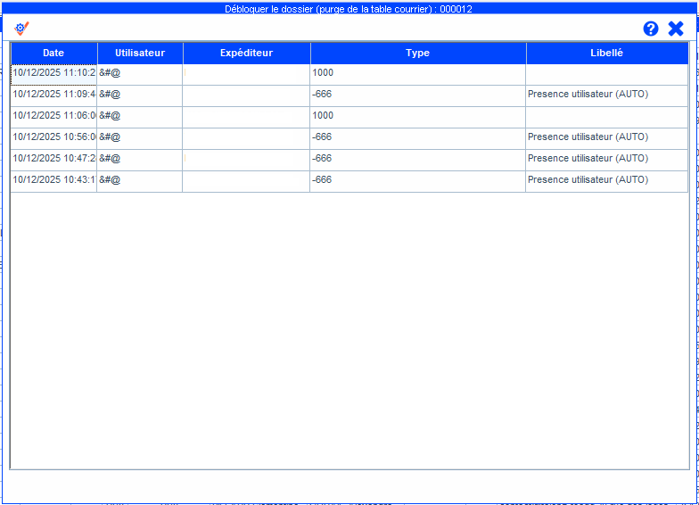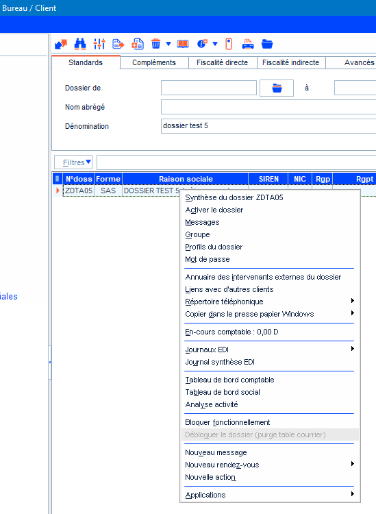 Si la ligne Débloquer le dossier (purge table courrier) est grisée, aucune action n’est nécessaire.