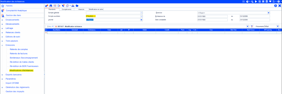 - Ouvrir : Autres missions > Gestion des tiers > Emissions > Modification d’échéances.