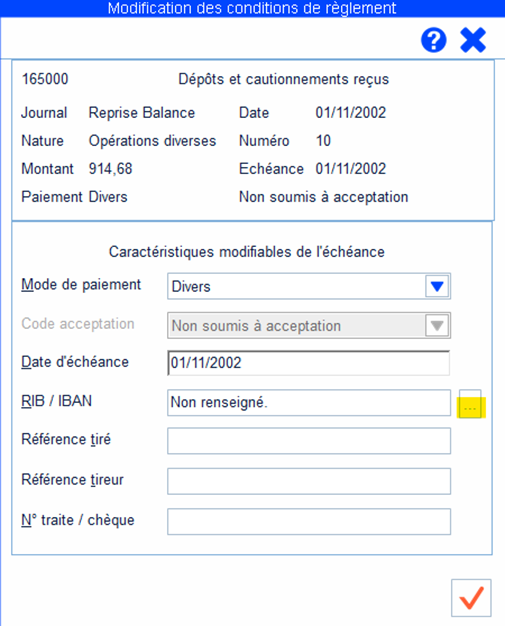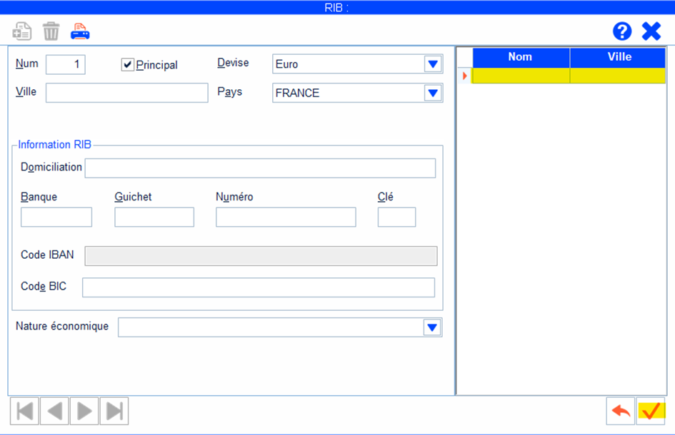 Dans la fenêtre RIB, sélectionner le compte bancaire voulu (ou le créer) puis valider.
